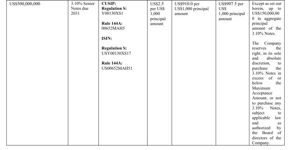 (ii) US$150,000,000 in aggregate principal amount of the outstanding 3.10% Senior Notes due 2031, CUSIP: Y00130XS1, ISIN: USY00130XS17 (Regulation S) and CUSIP: 00652MAH5, ISIN: US00652MAH51 (Rule 144A) (the “3.10% Notes”),