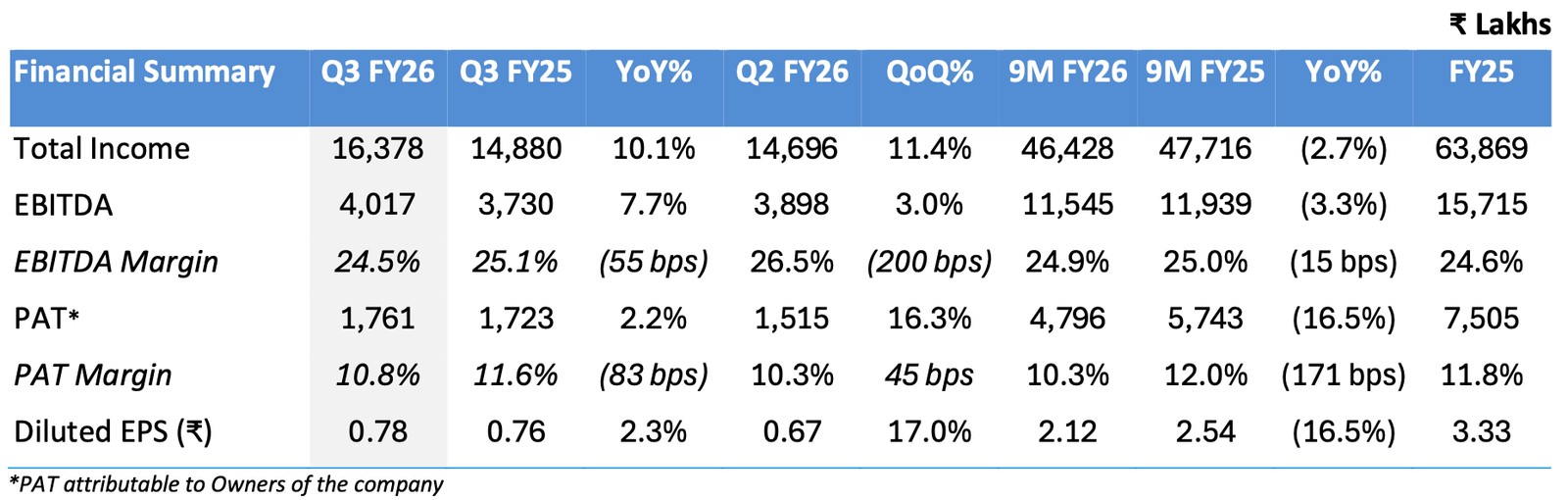 On the financial front, Total Income for the quarter stood at INR 16,378 lakhs, registering a year-on-year growth of 10.1% and a quarter-on-quarter growth of 11.4%. EBITDA for the quarter was INR 4,017 lakhs, reflecting an increase of 7.7% year-on-year and 3.0% sequentially, with an EBITDA margin of 24.5% in Q3 FY26. Profit after tax stood at INR 1,761 lakhs, growing 2.2% year-on-year and 16.3% quarter-on-quarter, resulting in a PAT margin of 10.8%.