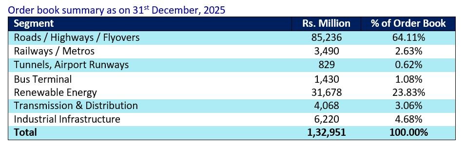 As on December 31, 2025, our total order book stood at INR 1,32,951 million, providing healthy revenue visibility. During 9M FY26, we continued to strengthen our presence beyond roads and highways, with increasing traction in renewables, transmission & distribution, and industrial infrastructure. This strategic diversification is enabling us to participate in structurally high-growth sectors while building a more resilient and balanced portfolio over the medium term.