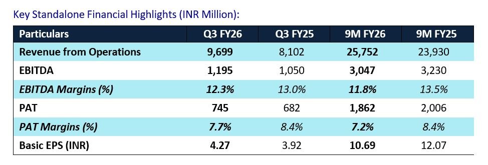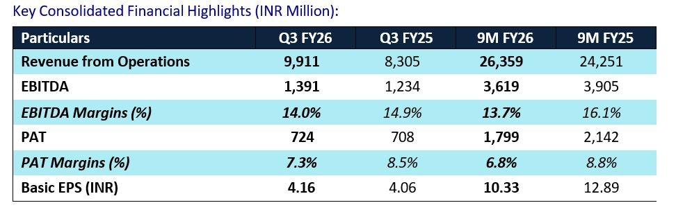 For Q3 FY26, consolidated revenue from operations stood at INR 9,911 million, reflecting a YoY growth of 19.3%, while consolidated EBITDA was INR 1,391 million with margins at 14.0%. For 9M FY26, consolidated revenue reached INR 26,359 million, up 8.7% YoY, with consolidated EBITDA of INR 3,619 million and margins of 13.7%.