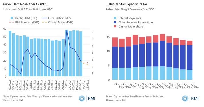 Yet, domestic economic aspirations and external political reality mean India faces fresh spending needs. The government has set a goal of India becoming a developed nation by 2041. This vision – commonly known as Viksit Bharat – will require public investments in infrastructure and support for small to medium-sized enterprises. Unfortunately, a side effect of past fiscal consolidation efforts was to reduce capital expenditure vis-à-vis GDP (see right chart above).