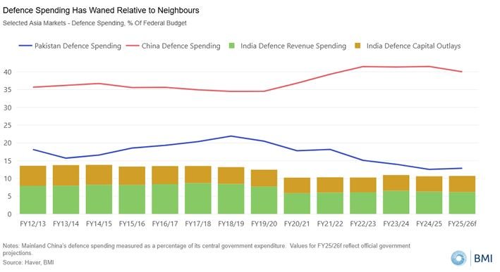 India’s more dangerous external environment also presents new spending needs. The country has engaged in armed conflict with the People’s Republic of China and Pakistan during the past five years. At the same time, defence spending as a share of central government expenditure has stagnated, after faling significantly during 2018-2020 (see chart below). China’s elevated defence spending levels, along with Pakistan’s recent decision to increase its defence budget mean New Delhi must consider spending more on security in FY2026/27.
