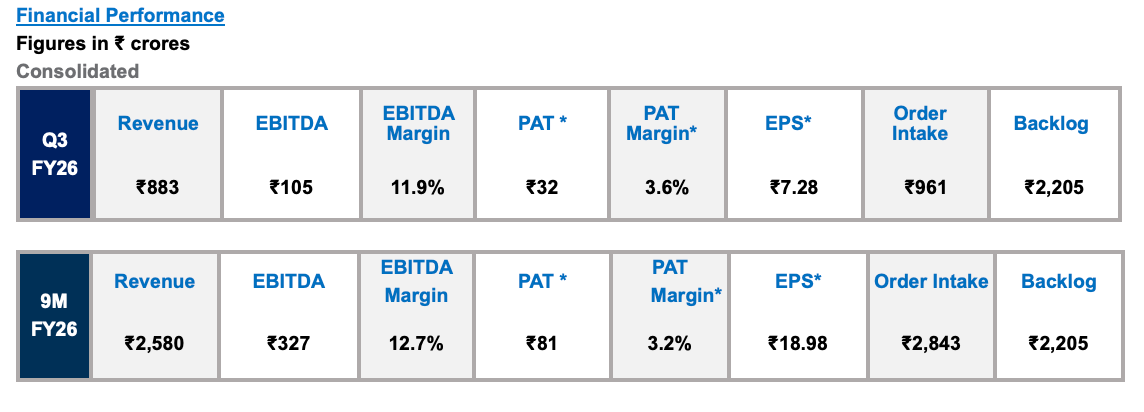 - 9M FY26 Order Intake of ₹ 2,843 Crores, up 16%.