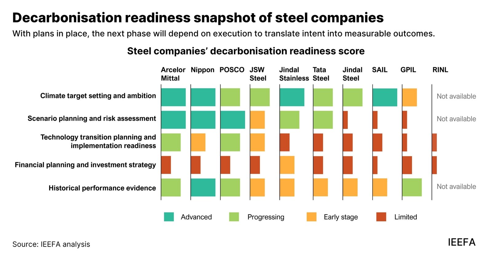 The analysts evaluated the decarbonisation readiness of a sample of ten steel producers — seven Indian and three global peers — assessing the connection between their stated emission reduction targets and their actions in terms of strategic planning, operational capabilities, and financial alignment. The Indian companies assessed include JSW Steel, Tata Steel, Steel Authority of India Limited (SAIL), Jindal Steel, Rashtriya Ispat Nigam Limited (RINL), Jindal Stainless Limited, and Godawari Power and Ispat Limited (GPIL), while the global companies are ArcelorMittal, POSCO, and Nippon Steel.