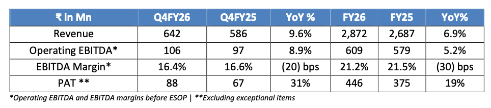 • Topline trajectory driven by strong internal execution and demand momentum – While Q4 revenue growth accelerated to ~10% on YoY basis, it grew by ~7% to ₹2,872 Mn.