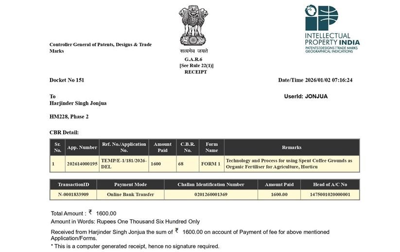 Mohali: The Directors of Jonjua Overseas Limited – Major Harjinder Singh Jonjua, Retd. and Harmanpreet Singh Jonjua have filed a patent application titled ‘Technology and Process using Spent Coffee Grounds as Organic Fertiliser for Agriculture, Horticultural and Botanical Gardens to Improve Soil and Plant Quality, Increase Productivity, and to Reduce Carbon Footprint’ vide Controller General of Patents, Designs & Trade Marks C.B.R. No. 68 dated January 2, 2026 reproduced below.