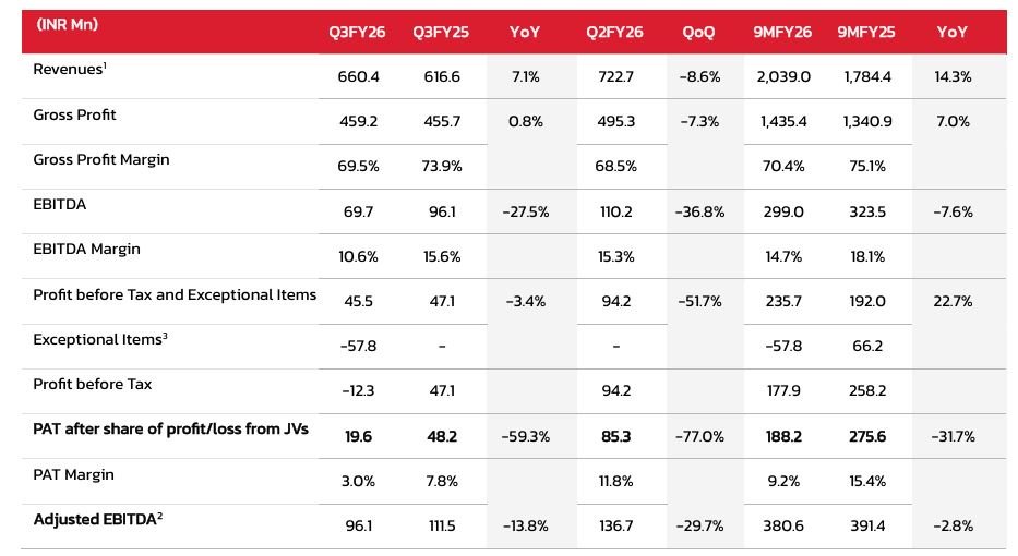 • INR 66.2 Mn worth of exceptional Item pertaining to gain on property sale was recorded in Q1FY25. Therefore, 9M FY25 is a non-comparable higher base.