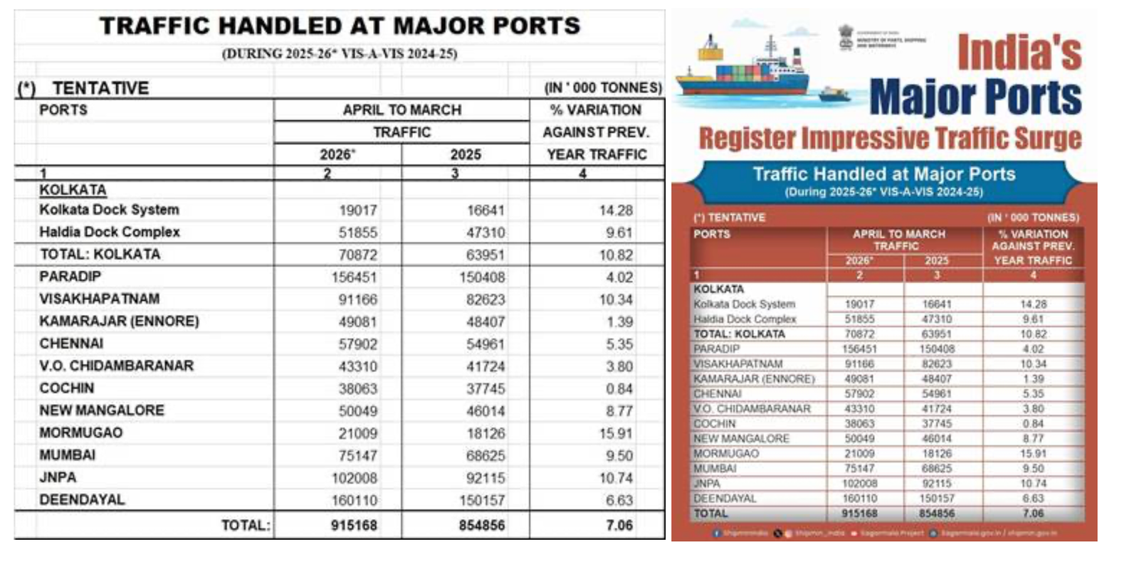 Major Ports Record 915 Million Tonnes Cargo in FY 2025–26, Surpass Target with 7.06% Growth