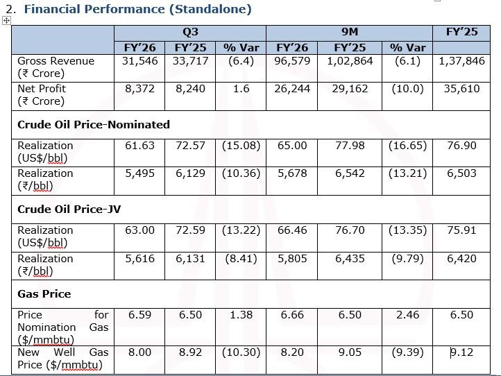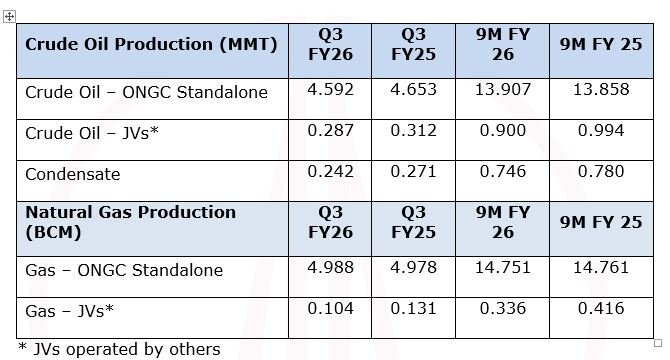 ONGC registered an upward growth of 0.35% in Crude Oil production during 9M FY’26 while Natural Gas production remains constant during the same period. The detailed production performance of ONGC is as under: