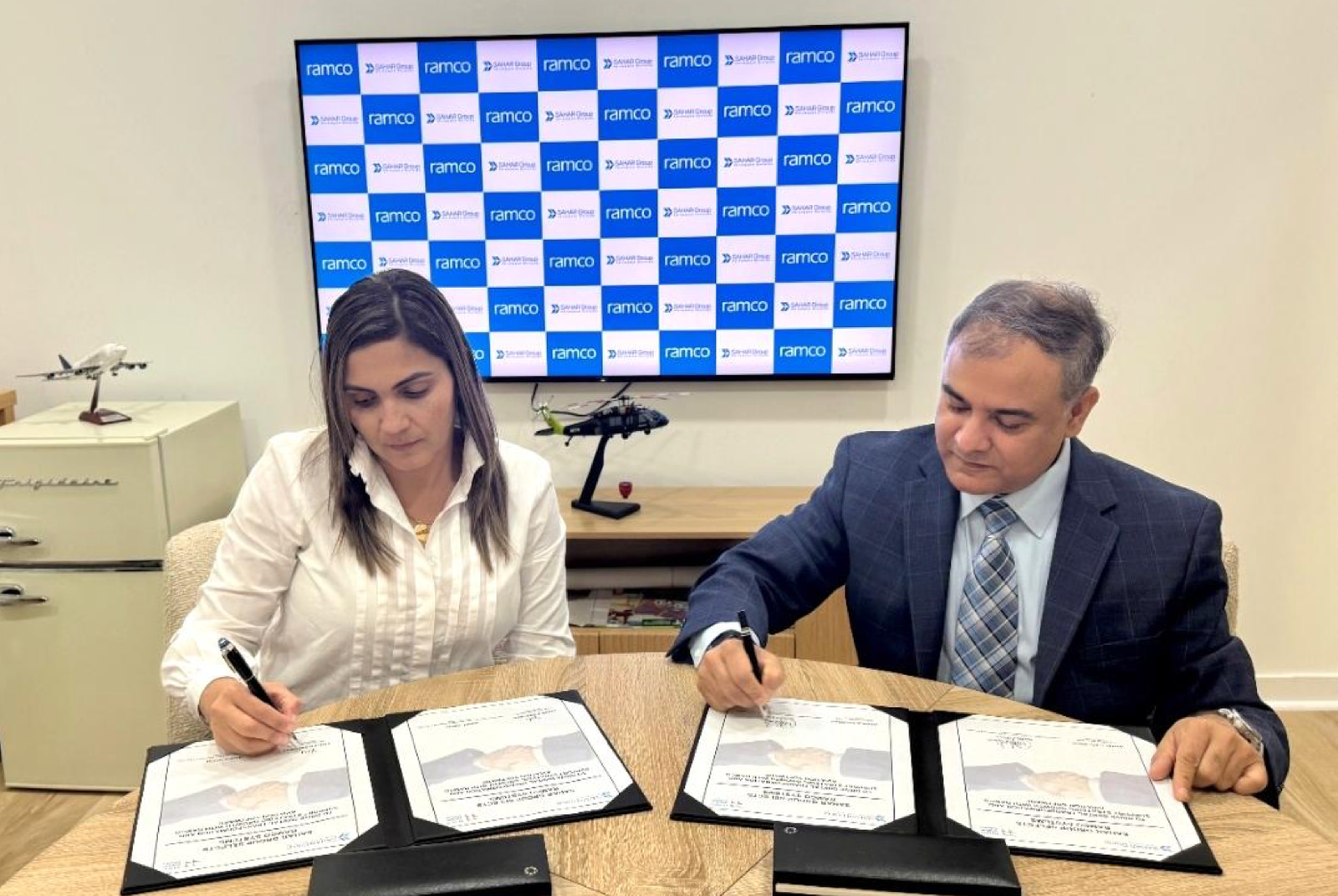 (L-R) Sahily Támara, Cofounder & VP of Operations, Sahar Group, and Manoj Kumar Singh, Chief Customer Officer – Aviation, Aerospace & Defense, Ramco Systems, during the signing ceremony held at Sahar Group’s office in Miami