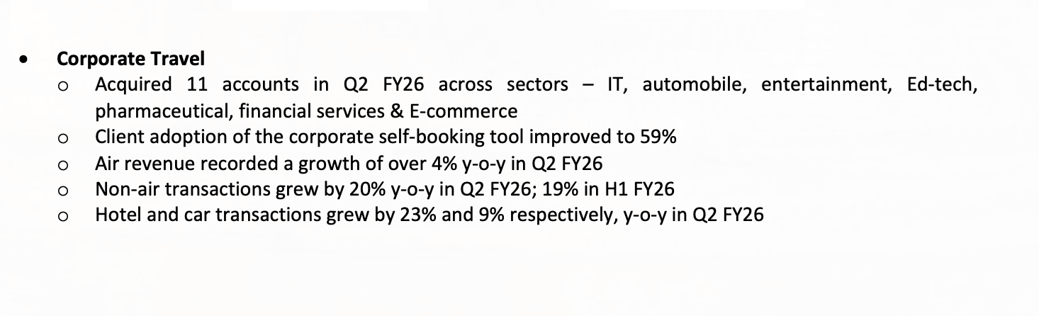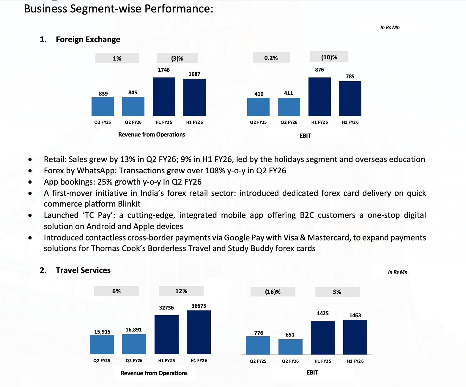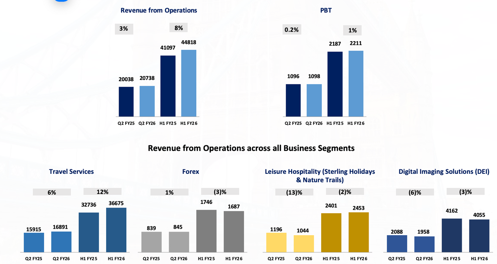 - Travel Services: Revenue from Operations grew to 12% y-o-y in H1 FY26 and 6% y-o-y in Q2 FY26