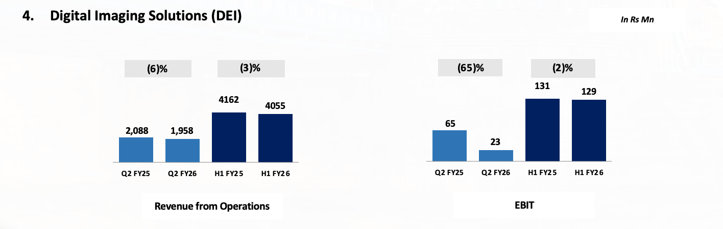 - Digiphoto Entertainment Imaging (DEI): Revenue from Operations declined by (3%) in H1 FY26 and (6%) in Q2 FY26, due to the geopolitical issues affecting home markets in the Middle East