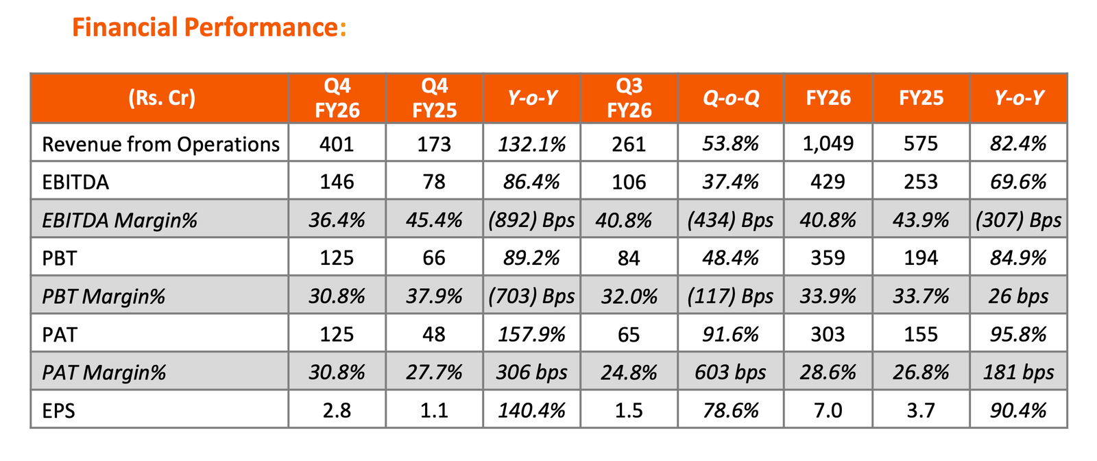 The company’s full year PAT stood at Rs. 303 crore, up 95.8% as compared to Rs. 155 crore for FY25. Revenue for FY26 was at Rs. 1,049 crore, a growth of 82.4% as against Rs. 575 crore in FY25. EBITDA margin for FY26 was at 40.8%, against 43.9% in FY25.